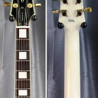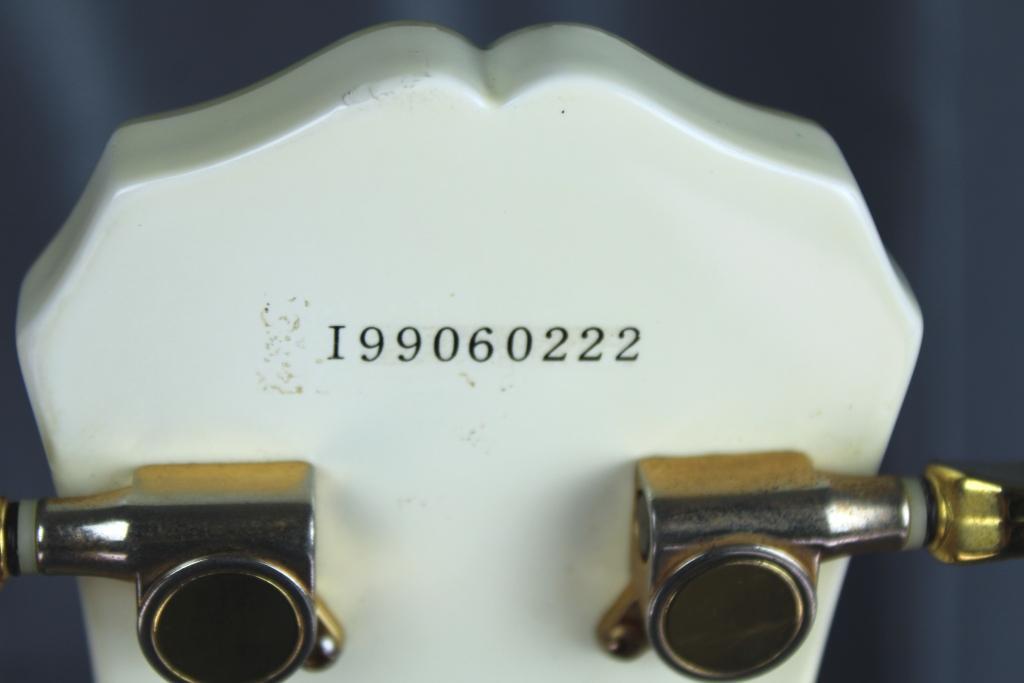 Epiphone Les Paul CUSTOM White, sous licence GIBSON. Excellentes sonoritées, micros imposants, puissants et un très bon confort de jeu. Peu de différences avec les modèles Japan.
