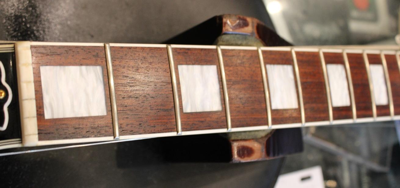 Particularité des séries japonaises : la forme de la tête est identique aux LP Gibson (Gibson Open Book Headstock) et un vrai binding (peinture crème sur les modèles Coréens).