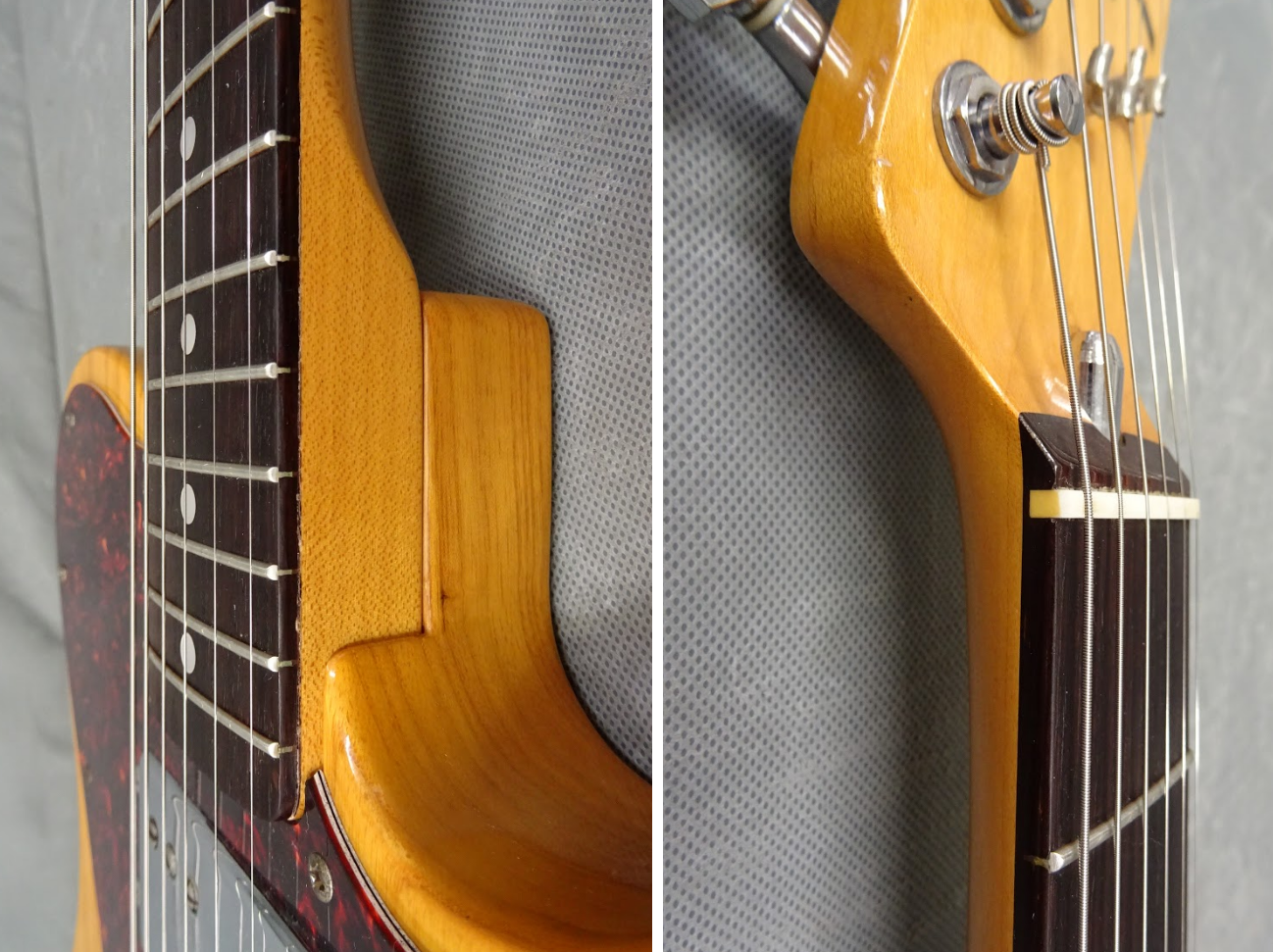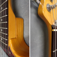 Elle se différencie notamment par son sélecteur en bas de caisse et non en haut. La lutherie est ultra soignée, bois sélectionné. Bien qu’elle soit assez récente, le sustain est monstrueux. A vide, elle sonne déjà ! Le manche est hyper agréable. Le jeu est vraiment facile. Le vernis du manche est très brillant et rapide. Manche en ’C’. Le palissandre de la touche ne démérite pas non plus, foncé et dense.