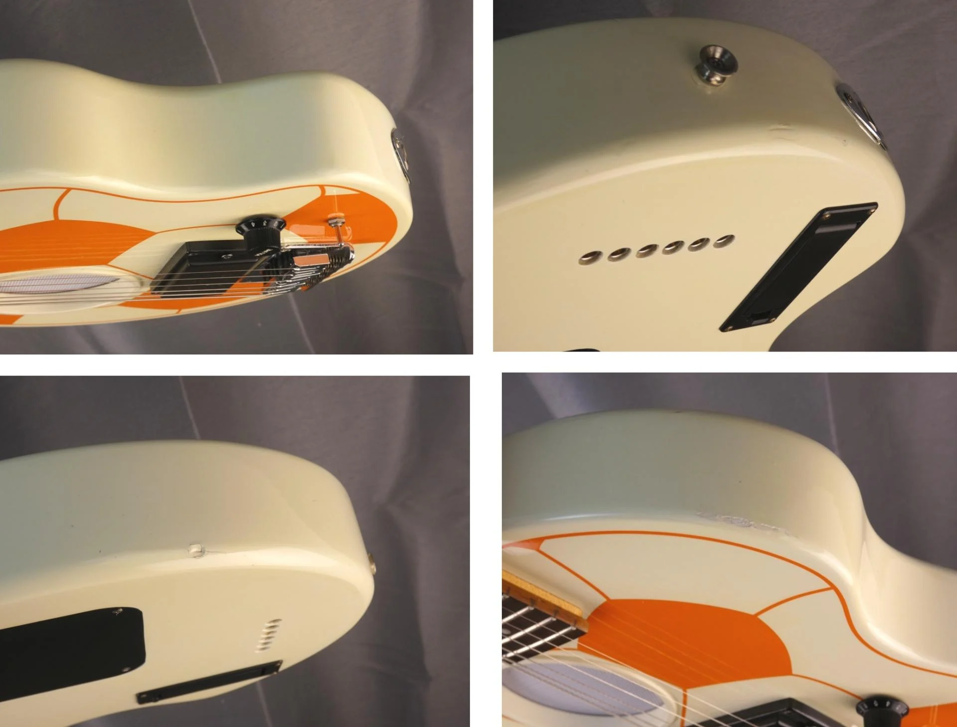 Non-importée en Europe et c’est bien dommage car cette guitare n’est pas un gadget ni un jouet… ou plutôt un jouet pour les grands. Format mini-guitare et 22 frettes, idéal pour jouer devant la télé devant un match de foot ! Enceinte intégrée alimentée par pile 9v et un potentiomètre volume. Sonorités précises, puissantes, plutot prévue pour jouer en disto ! grâce au humbucker en position chevalet. Branchée sur ampli, çà envoie !! le micro est excellent. Lutherie de qualité.