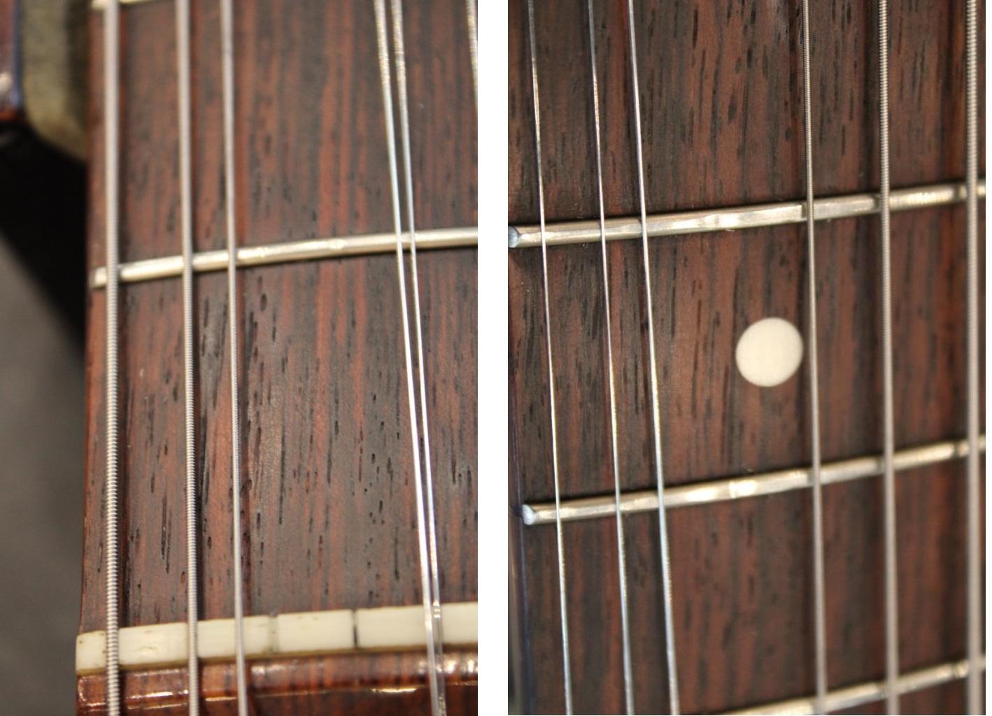 Quelques marques de vie sur le corps, très bon état général, frettes jouées : état 6 à 7/10 mais bonne jouabilité, pas de frise. Très bonne lutherie